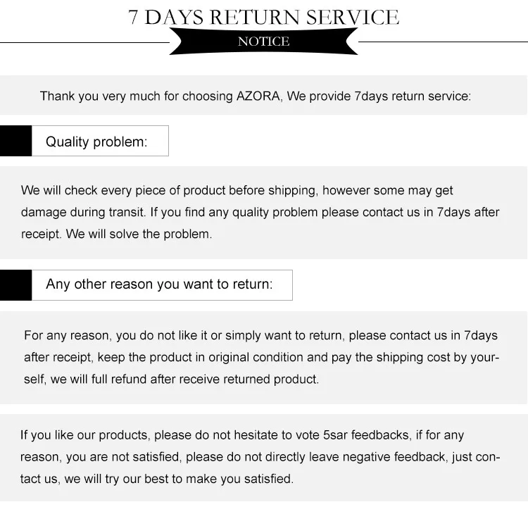If the product you receive is not as described or low quality, the seller promises that you may return it before order completion (when you click "Confirm Order Received" or exceed confirmation timeframe) and receive a full refund. The return shipping fee will be paid by you. Or, you can choose to keep the product and agree the refund amount directly with the seller.N.B.: If the seller provides the "Longer Protection" service on this product, you may ask for refund up to 15 days after order completion.