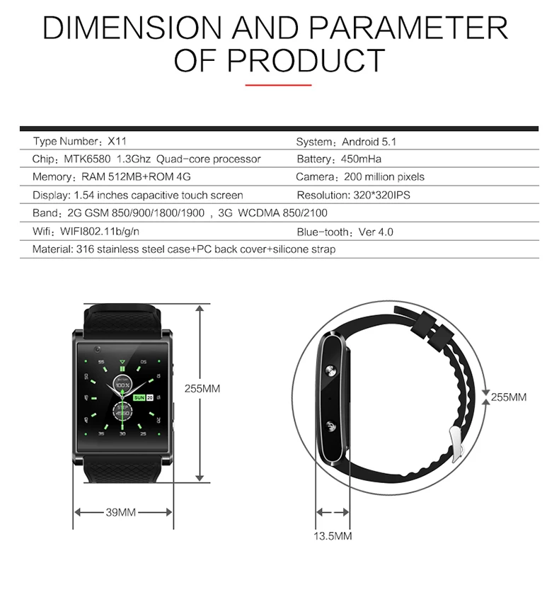 Specification: Product Modelling: Android 5.1 WiFi Smart WatchScreen: 1.54 inch Capacitive touch and cambered surface stereoCamera: 200W pixelsSpeaker: yesMic: yesVibration Motor: yesAntenna: within the watchbandSide Key: With Startuo & shutdown keySIM Deck: support Nano SIM Hardware Platform: MTK6580 Quad coreGGSM: Support, GSM Quad-band:850/900/1800/1900,WCDMA Supports 1-2 frequency band: 2100/1900+900/850Memory Configuration: ROM 4G+ RAM 512MBluetooth: Support, BT4.0WIFI: SupportGPS: SupportSPK Power Amplifier: SupportG-Sensor: Support, Sleep Monitoring, Step Calculation Extra TF card: not support
