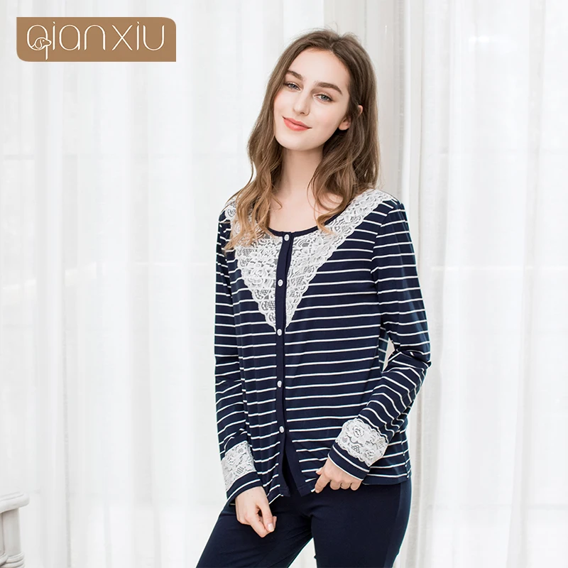 Big Stock Deals Qianxiu 2017 Long Sleeved Ladies Stripe Cotton Pajamas Set for Women Pijama Mujer Sleepwear Set 1787 fashion sale Rating: 4.9 out of 5