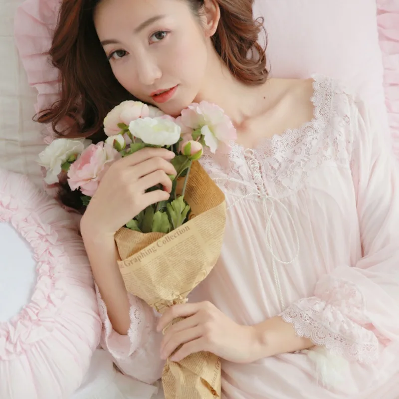 Wonderful Promotion Womens Long Retro Palace Sleepwear Female Sweet Princess Sleeping Homewear Lady Lace Sexy White Pink Pajamas Set fashion sale Rating: 4.1 out of 5