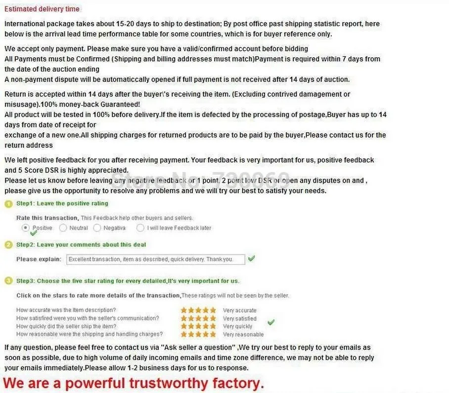 If the product you receive is not as described or low quality, the seller promises that you may return it before order completion (when you click "Confirm Order Received" or exceed confirmation timeframe) and receive a full refund. The return shipping fee will be paid by you. Or, you can choose to keep the product and agree the refund amount directly with the seller.N.B.: If the seller provides the "Longer Protection" service on this product, you may ask for refund up to 15 days after order completion.