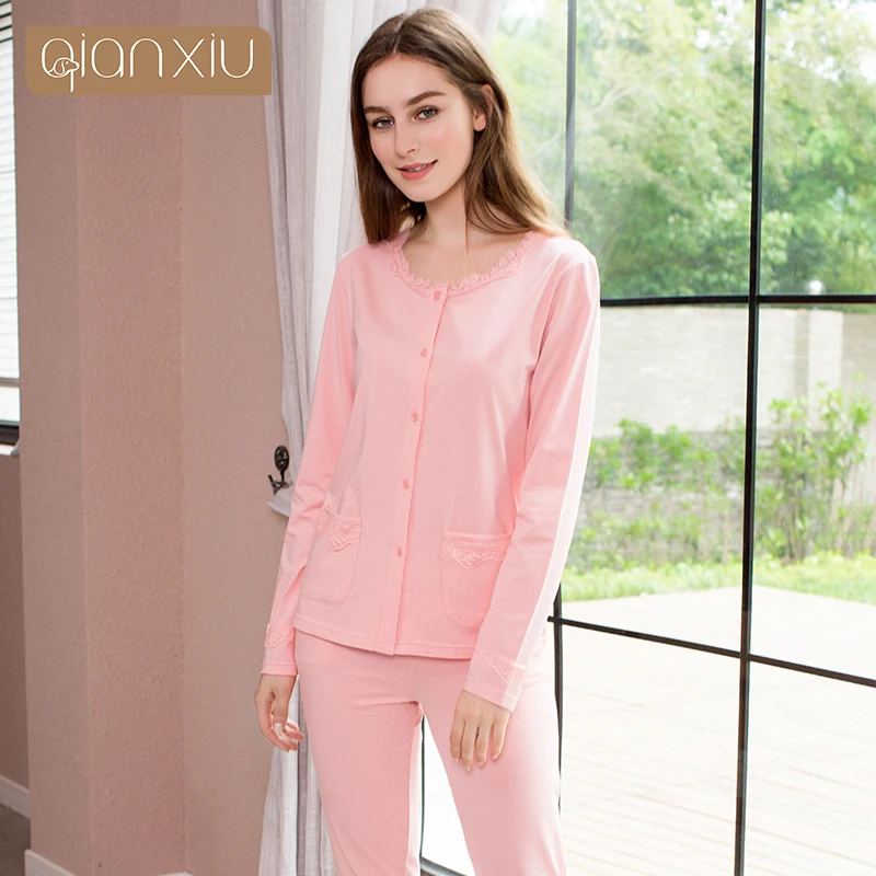 Hurry! Special 2017 New Lace Long Sleeved Ladies Soild Color Cardigan Cotton Pajamas Set for Women Pijama Mujer Sleepwear Set 1790A fashion sale Rating: 4.8 out of 5