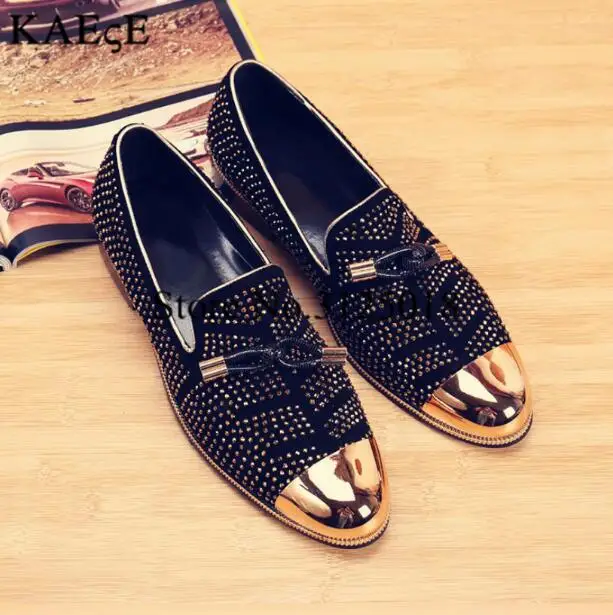 Black Suede Men Party Wedding Ventilation Casual Studded Shoes Sapato Masculino Metal Toe MenS Flat Loafers