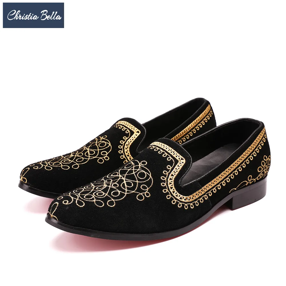 Christia Bella Vintage Embroidery Men Velvet Shoes Fashion Wedding Banquet Loafers Gold Men Dress Shoes Moccasins Men Flats Shoe