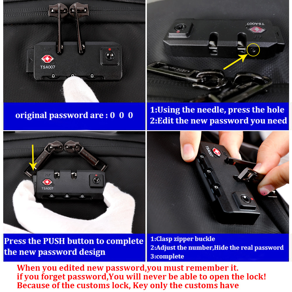Cheap price no lock, If you need to lock the backpack, please buy high pricePassword lock to use introduction:Picture one:original password are : 0 0 0Picture two:change the new password method 1:Using the needle, press the hole 2:Edit the new password you needPicture three:Press the PUSH button to complete the new password designPicture four:1:Clasp zipper buckle 2:Adjust the number,Hide the real password 3:complete Please note:you edited new password,you must remember it.if you forget password,You will never be able to open the lock!Because of the customs lock, Key only the customs have ARCTIC HUNTER designer laptop backpacks men password lock backpack Waterproof Bag Casual Business Travel Bag Male B00208